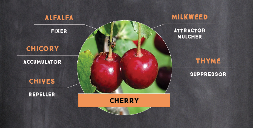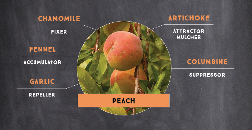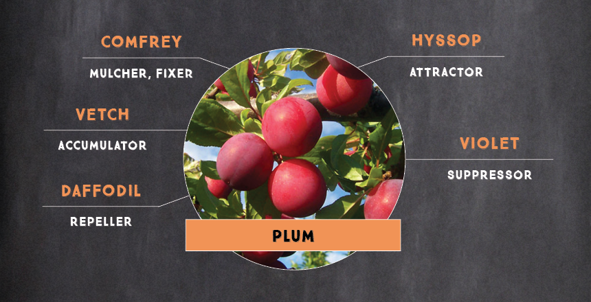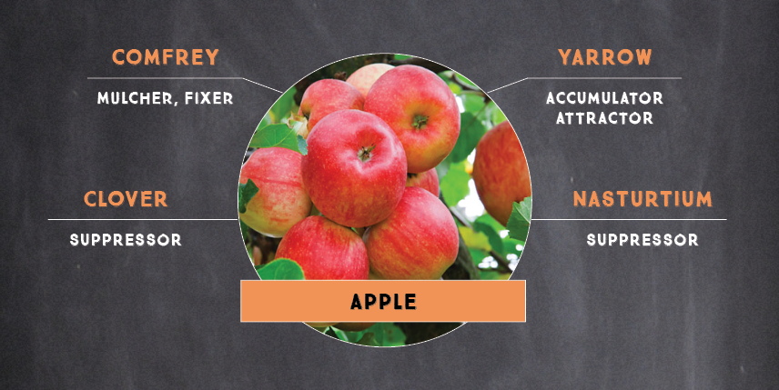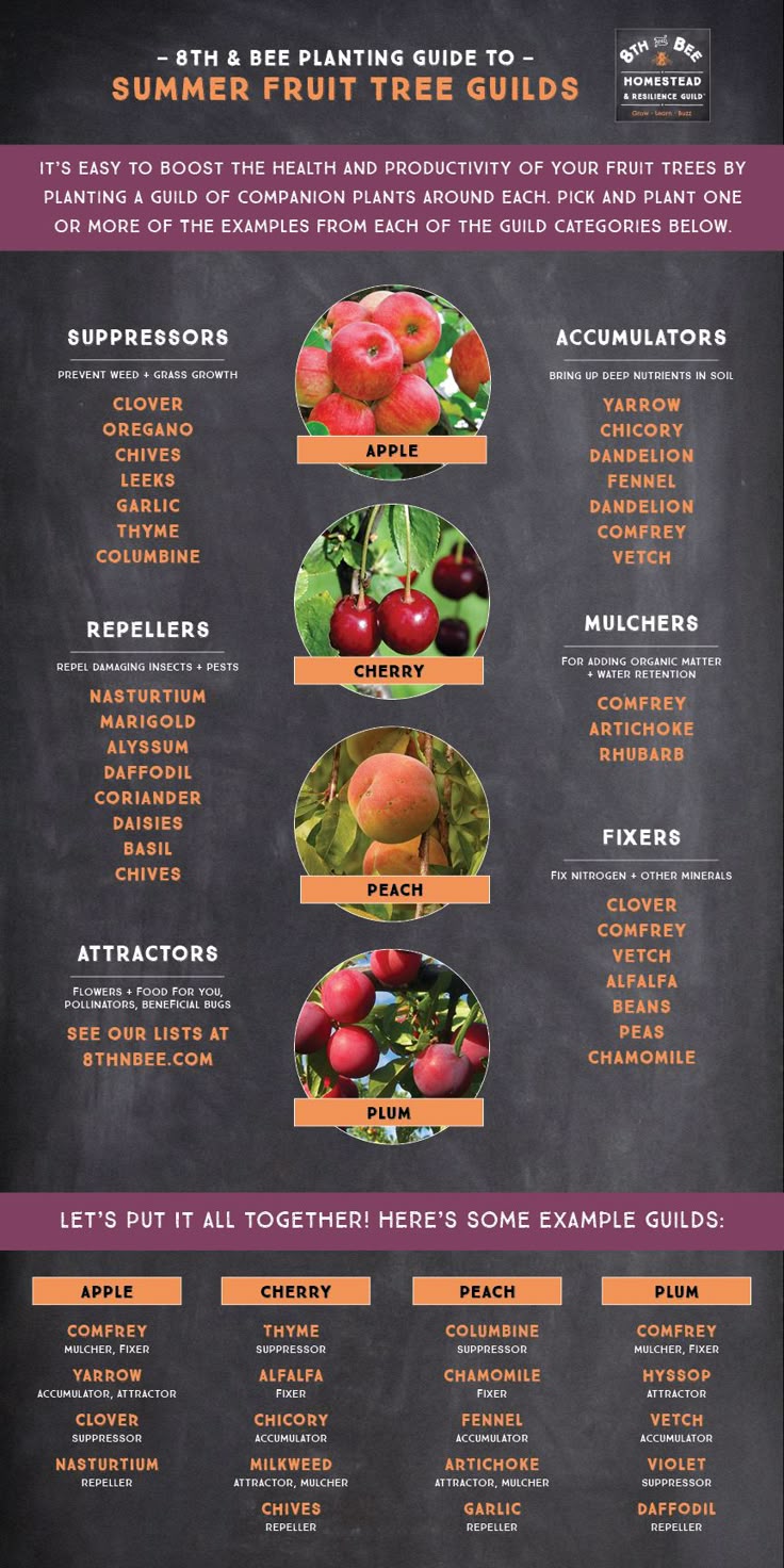 Here's a few fruit tree plant guild examples. Feel free to swipe these or come up with your own combinations: