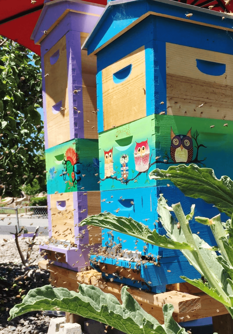 Protect the pollinators and save the bees! The City of Petaluma allows for up to two colonies in residential yards, and Ixchel’s long-standing wish to be a beekeeper came true in early 2015. Since setting up the initial nucs (short for nucleus). Between the trees, the hugel, and our edge plantings, we provide plenty of bee forage throughout the property and our neighbors comment frequently about how much more productive their own fruit trees have been.