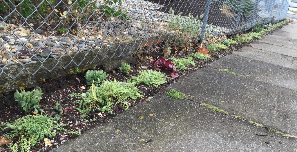 One of the core concepts of permaculture is to find form and function all the way to the edges of your space and beyond. Situated on a corner lot, we had 100+ feet of sidewalk-adjacent strip outside of our fence. When we moved in — all weeds, dead grass, and doggy pit stop.